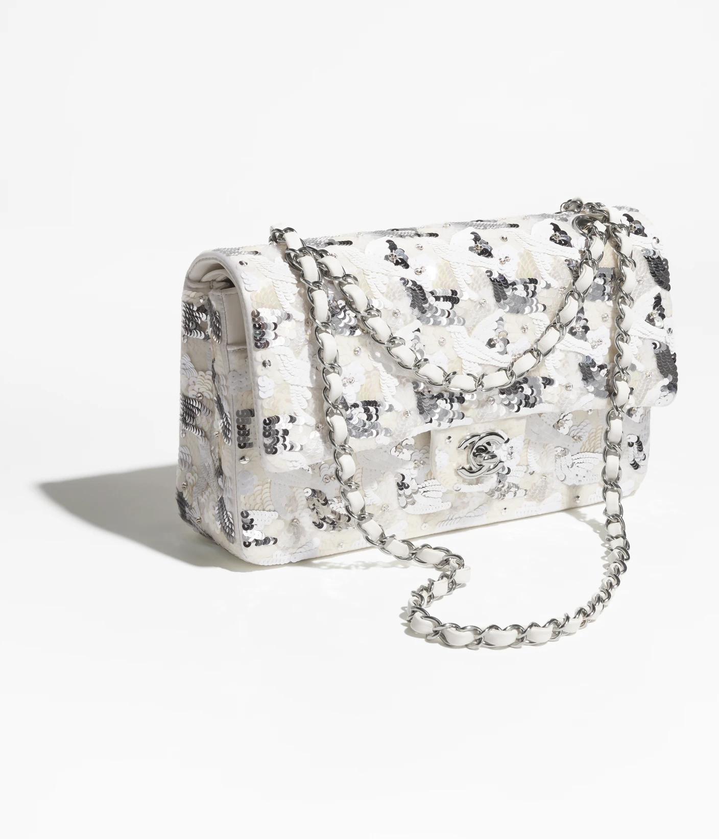 Embroidered Satin, Sequins, Glass Pearls & Silver-Tone Metal White & Silvery